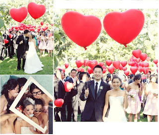 Uma foto de uma noiva com balões de coração vermelhos segurando..
